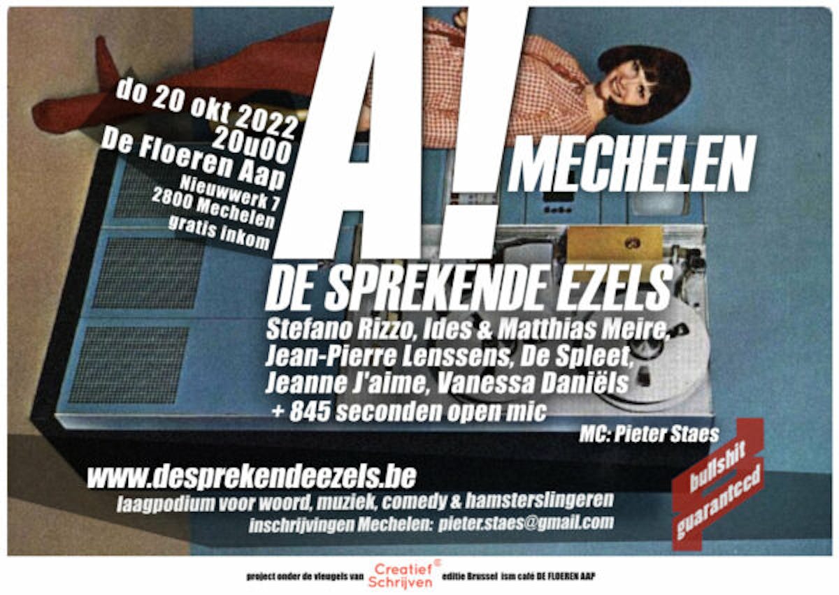 De Sprekende Ezels is het laagpodium van Creatief Schrijven vzw voor woord, muziek, comedy, hamerslingeren, enz. Je ontdekt er kersvers en gevestigd talent. Elke derde donderdagavond van de maand balken De Sprekende Ezels in Mechelen.