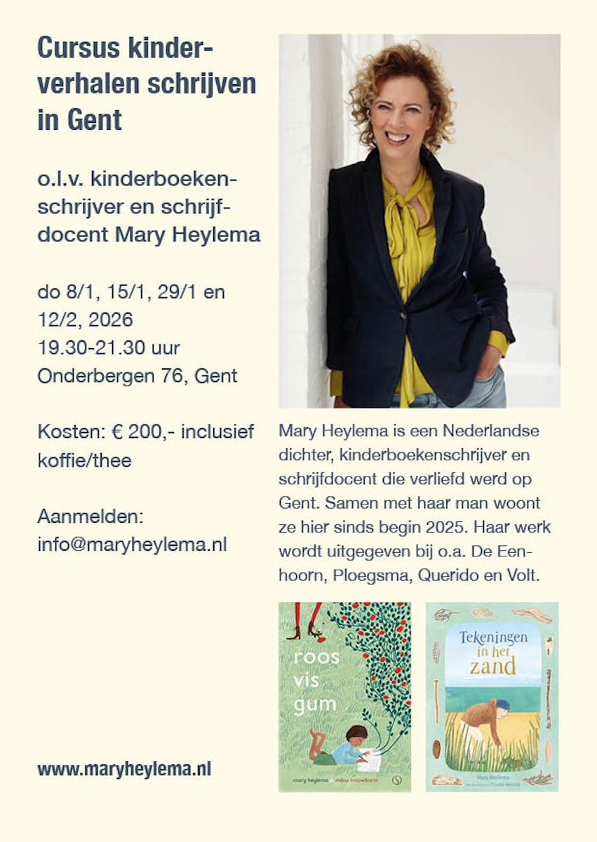 Vier donderdagavonden ga je samen met kinderboekenschrijver en schrijfdocent Mary Heylema aan het werk. Hoe denken kinderen? Hoe creëer je een personage van vlees en bloed? Welk verhaalidee wil in jou tot leven komen? Bij welke leeftijd sluit jouw manier van schrijven het beste aan? Korte, afwisselende schrijfopdrachten zullen je helpen hier een antwoord op te vinden.