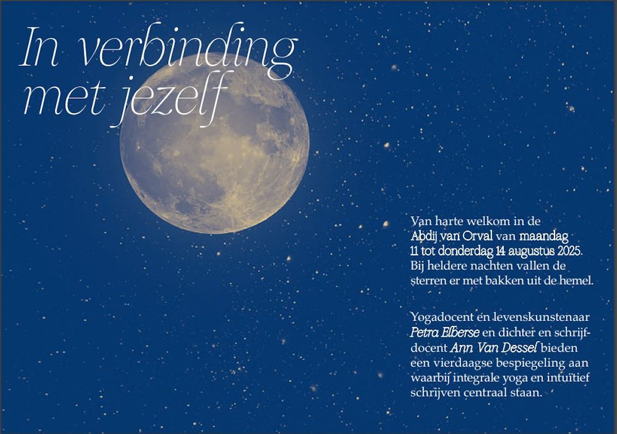 Van harte welkom in de Abdij van Orval van maandag 11 tot donderdag 14 augustus 2025. Bij heldere nachten vallen de sterren er met bakken uit de hemel. Yogadocent en levenskunstenaar Petra Elberse en dichter en schrijfdocent Ann Van Dessel bieden een vierdaagse bespiegeling aan waarbij integrale yoga en intuïtief schrijven centraal staan.