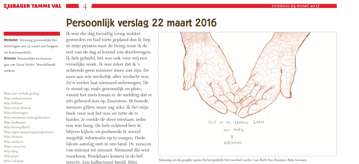 Hierbij gingen studenten uit het Basisjaar Literair Schrijven onder leiding van dichter en docent Xavier Roelens in 2017 aan de slag met 3000 artikelen rond de aanslagen in de workshop 'Taal en tekst'. Uit de samenwerking ontstond het krantje 'Zeebaken / Tamme val'.