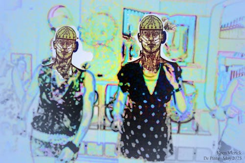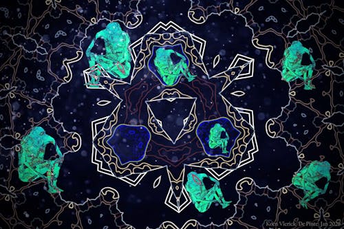Rond 1995 heb ik dat werk gemaakt. Ik noem het "altaar der culturen."Links ziet men een tv, onze gemeenschappelijke identiteit valt van het - silicium - glas - zand.De gemeenschappelijke informatiebronnen zijn verdwenen.De wijzen van vroeger opgevolgd door radio en uiteindelijk als laatste de tv die een ongeveer gemeenschappelijke boodschap uitdragen is niet meer.De informatie is versplinterd.Rechts ziet men een gietijzeren kandelaar daar in een mensenhoofd in papier. Stukken teksten. Krantenpapier "De encyclopedische mens".Gietijzer = nationalistenKandelaar = religieIn het midden staat de hedendaagse mens. Opgesloten. "de encyclopedische mens".Dit deel is gemaakt van een reclame voor lippenstift.Regeneratie KosmetikIn de dubbele wand gaan luchtbellen in het water de hoogte in.In die dubbel - transparantie - plexiglas zit diezelfde "encyclopedische mens".Het geheel staat op dunne platen, glas = chips = zand = silicium.Het geheel steunt op een gietijzeren pilaar = industriële cultuur.De gietijzeren plaat staat op de grond = landbouwcultuur.HET ALTAAR DER CULTUREN.