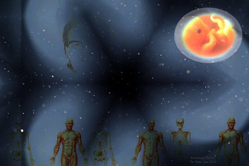 Ooit zullen de atomen in ons lichaam miljarden kilometers van elkaar verwijderd zijn, een afstand groter dan die tussen de zon en de aarde. Maar wat als er een grens zit aan die rekbaarheid? Misschien keert het heelal op een dag razendsnel terug naar zijn nulpunt, waarin alle materie weer wordt samengeperst. Na een nieuwe oerknal, in een tijdperk dat wij ons niet kunnen voorstellen, ontstaat er dan weer een blauwe planeet. En ergens in die nieuwe wereld bevindt zich dan weer dat allerkleinste deeltje dat ooit deel uitmaakte van jou en mij."
