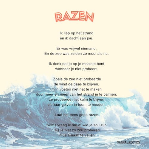 Weken later, zonder duidelijke aanleiding, zonder signaal is hij weg. Zijn blik is wazig en op de grond gericht of in het ijle. Als ze vraagt om oogcontact ziet ze alleen die verdomde spoken, hem vindt ze niet.Ze kruipt tegen hem in de zetel omdat woorden nu niet helpen, zachtheid misschien wel.Hij duwt haar van zich af. Ze schrikt. Wat heeft ze niet opgemerkt? Wat heeft ze gezegd? Wat heeft ze gedaan?Weken gaan voorbij. Geen zoen, geen aanraking, geen hand, niets.Ze wordt gek in haar hoofd en stelt vragen, ook aan externen.Ze mist hem, haar fantastische man die haar aanvult, opvult en laat vullen.Ze luistert, probeert te doen wat hij vraagt. Maar niets helpt.