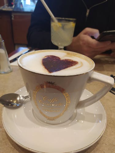 Ik bestelde. En natuurlijk ook onze extra koek voor onderweg. We waren niet voor niets als eerste opgestaan.
