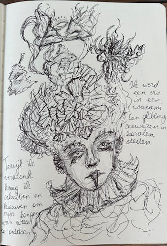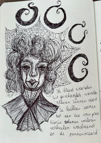 Wat in bevlekt katoen staat wil hij niet raden;zijn cape schuilt in de versleten voering,haar tere kus ademt nu zonder ziel.